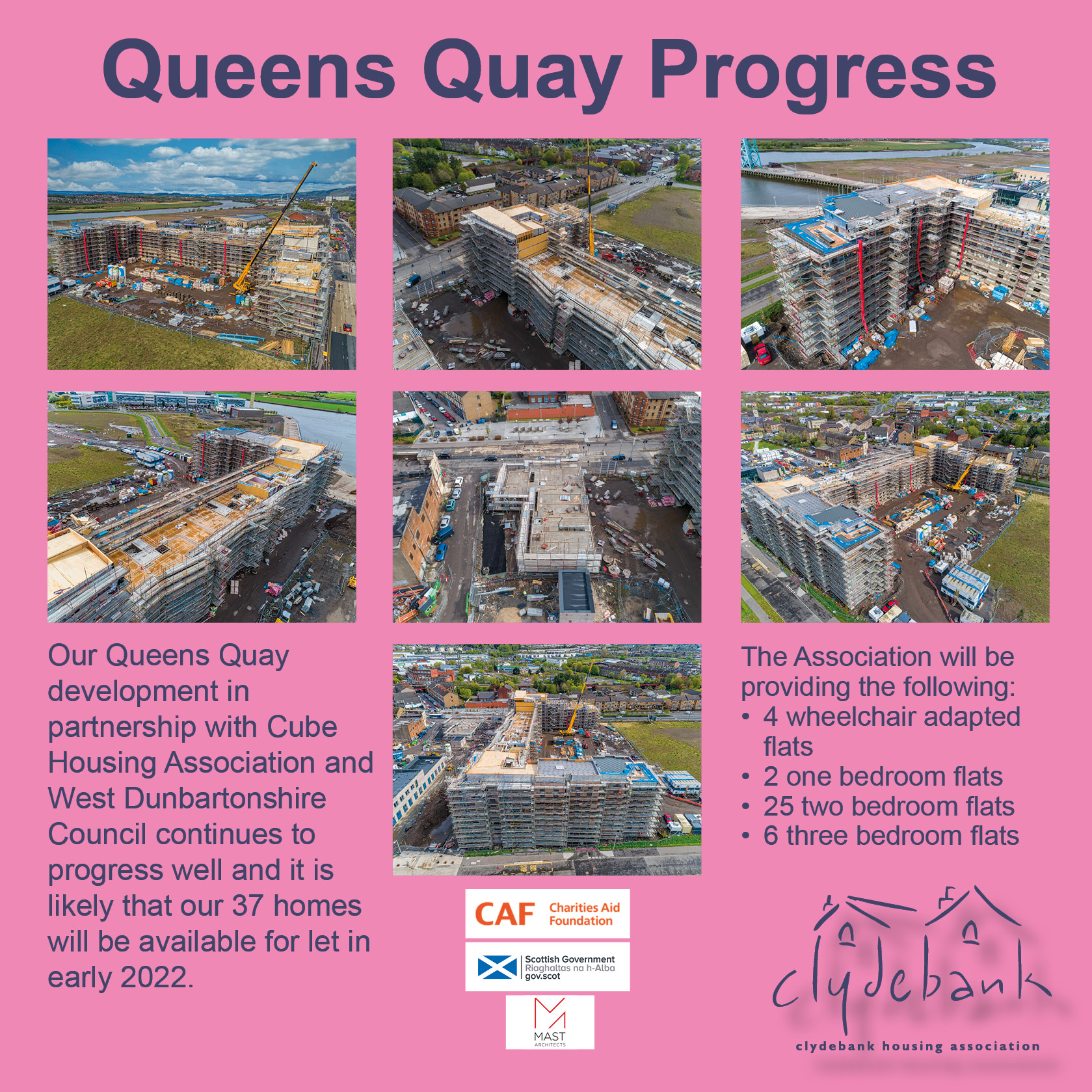 Our Queens Quay development in partnership with Cube Housing Association and West Dunbartonshire Council continues to progress well and it is likely that our 37 homes will be available for let in early 2022.
